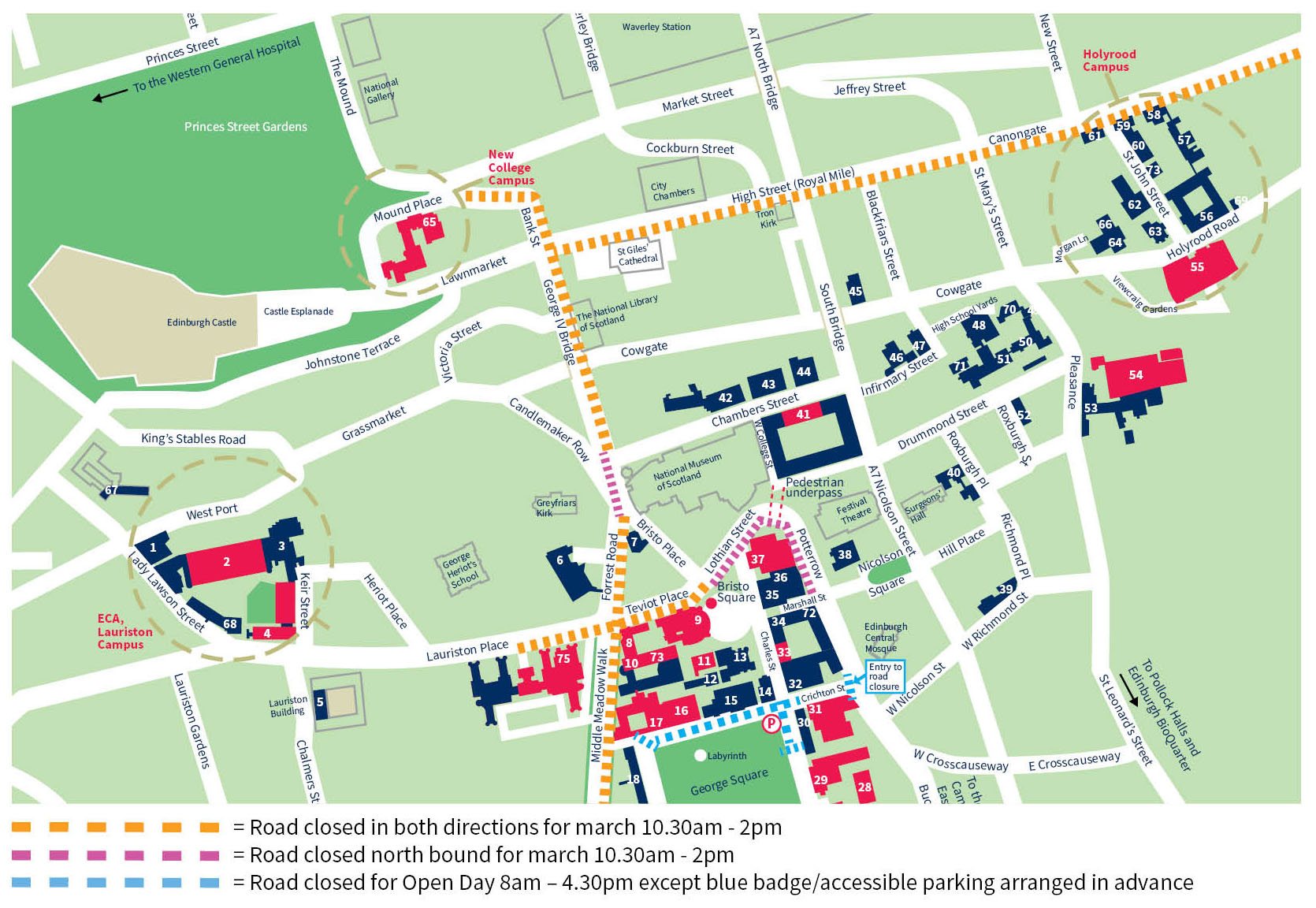 We strongly recommend that you travel to the University using public transport, as parking near our campuses will be extremely limited. Road closures on 25 October A large march is taking place through the centre of Edinburgh and near our Central campus area between 11am - 12.30pm, which may cause some disruption to travel.Roads will be closed to vehicles between 10am - 11.30am outside the Parliament on Horse Wynd and Queen’s Drive, then 10.30am - 2pm on Canongate, New Street, High Street, Bank Street, North Bank Street, George IV Bridge, Forrest Road, Potterrow (northbound), Teviot Place and Lauriston Place as far as Edinburgh Futures Institute. Those in bold are adjacent to Bristo Square and Edinburgh Futures Institute at our Central campus, and our Edinburgh College of Art campus.It may take a little longer to walk to or from the bus or train stations. Public transport services may also be busy at times before and after the march and rally, which finishes at 4.30pm.If you are walking between Bristo Square/George Square venues and Edinburgh Futures Institute, Edinburgh College of Art or New College for Open Day activities between around 11.30am – 12.30pm, please factor in additional time to cross the march with the assistance of event stewards.View a map of the road closures Low Emission Zone A Low Emission Zone (LEZ) is enforced in central Edinburgh. This covers much of the University’s Central campus area, including: George Square and Bristo SquareChambers StreetEdinburgh Futures InstituteOld CollegeNew CollegeEdinburgh College of ArtDriving a non-compliant vehicle into the LEZ will result in a penalty charge notice.Information about Edinburgh’s LEZ Parking Parking at our University campuses is not available to Open Day visitors except those with accessibility requirements. To prioritise the safety of our visitors, during the Open Days roads at our George Square campus will be closed to all vehicles, except those requiring blue badge or accessible parking, arranged in advance. Parking spaces on Buccleuch Place are also suspended in order to operate our Open Day shuttle bus service.You may find the City of Edinburgh Council website useful for finding parking in Edinburgh.City of Edinburgh Council: parking Car parks near Central campusThe car park closest to the Central campus is Quartermile (Q-Park), with the next closest at St Leonard’s (Easi-Park) or Holyrood Road (NCP). Quartermile (Q-Park)Nicolson SquareSt Leonard’s (Easi-Park)Holyrood Road (NCP)Parking near King's Buildings campusThere are no public car parks near our King’s Buildings campus. There are a few on-street parking bays in the area.We run a free Open Day shuttle bus service to King’s Buildings from our Central campus. Park and Ride As parking in the city centre is limited and can be expensive, you may prefer to make use of one of the many Park and Ride sites on the city bypass (A720). These sites offer free parking, with buses using the bus-only 'greenways' into the city, which reduces the journey time.Edinburgh Park and RideOptions with direct bus links to our campusesSheriffhall Park & Ride (South): bus service 33 stops close to our Central campus.Straiton Park & Ride (South): bus services 37, 47 and 47B stop close to our King's Buildings campus and Central campus.Hermiston Park & Ride (West): bus service 35 stops close to our Central campus.Ingliston Park & Ride (West): it is possible to take a tram to the centre of Edinburgh (Princes Street stop) which is approximately a 15 to 20 minute walk from our Central campus. Private coaches and minibuses If you plan to travel to our Open Day with a school coach or minibus, please contact us at ug.recruitment@ed.ac.uk.For safety reasons, coaches cannot stay parked at George Square or Buccleuch Place throughout the day, but we can provide directions to a suggested coach drop-off point, and a more detailed map of the University campuses. Planning your route The City of Edinburgh Council website lists current roadworks and travel disruption in the city.City of Edinburgh Council: roadworksRoute information for drivers can be found on the RAC or AA websites.RAC Route PlannerAA Route Planner This article was published on 2025-04-22